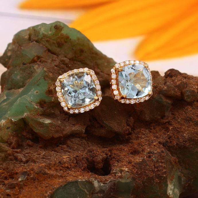 0.28 CT DIAMOND & 14K YELLOW GOLD AQUAMARINE STUDS EARRING