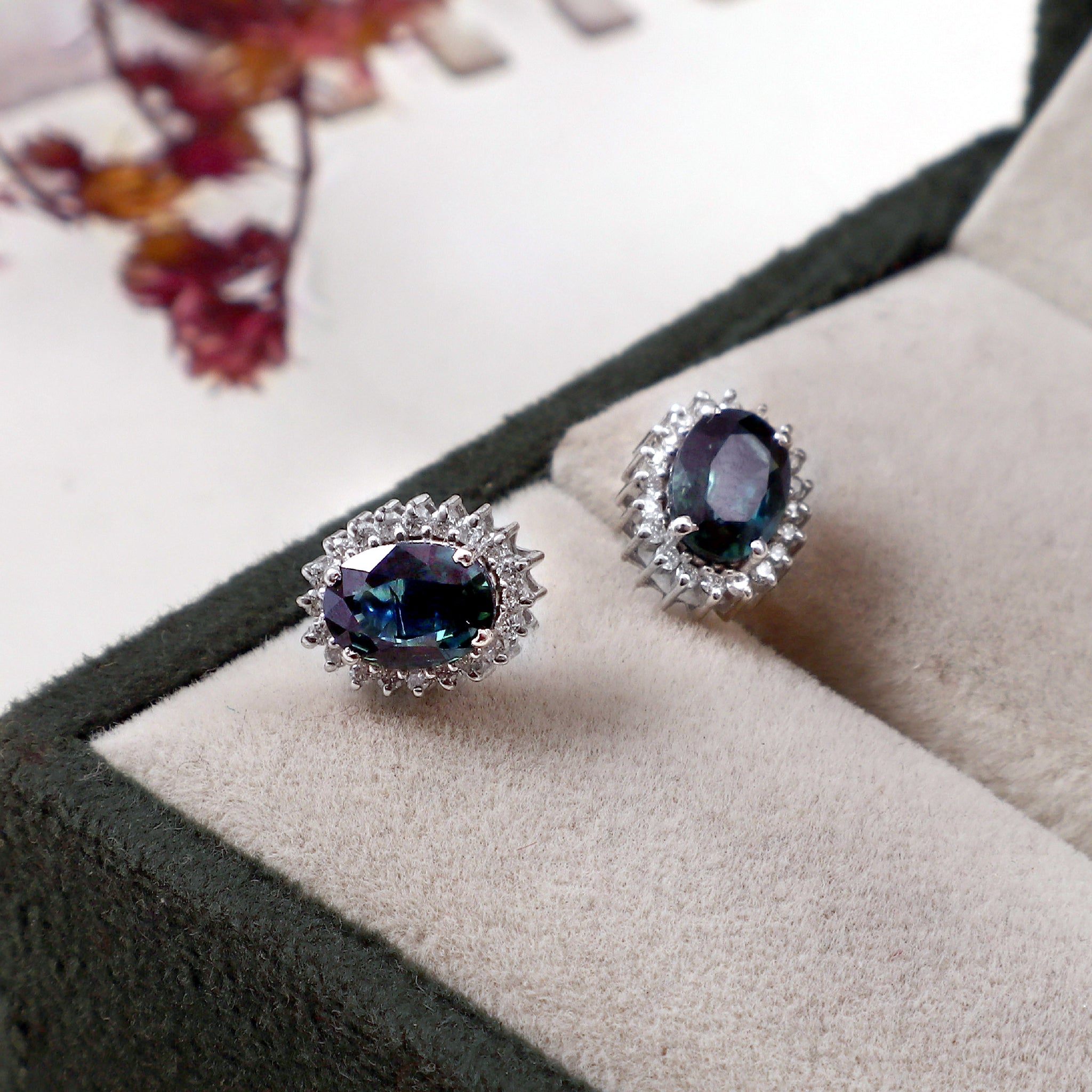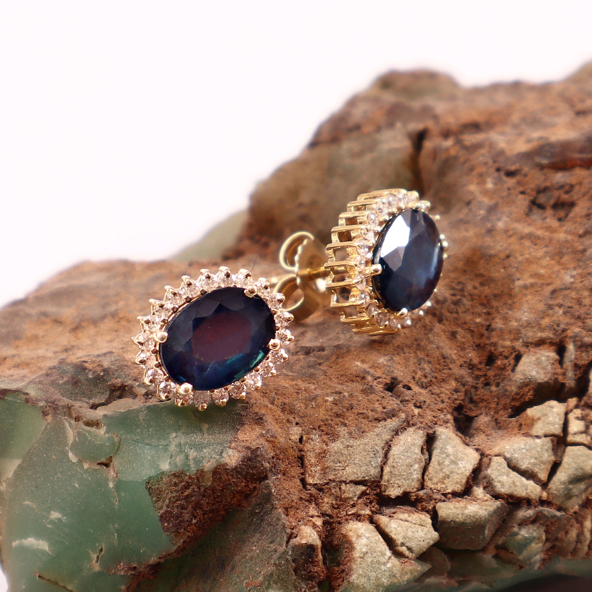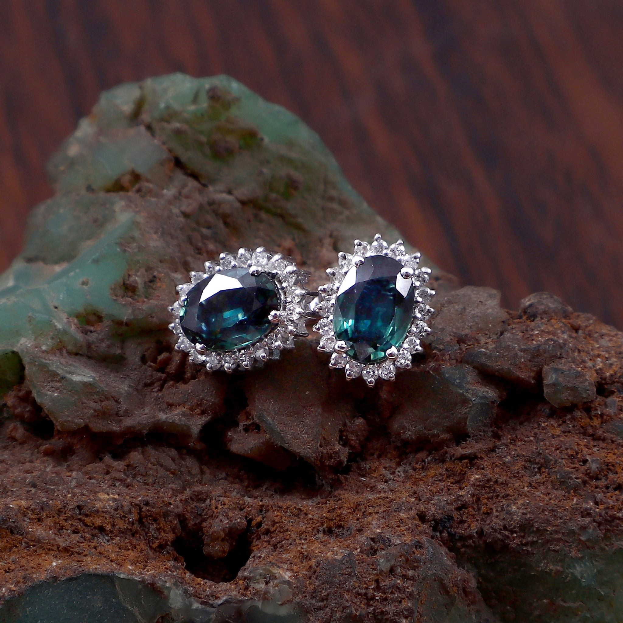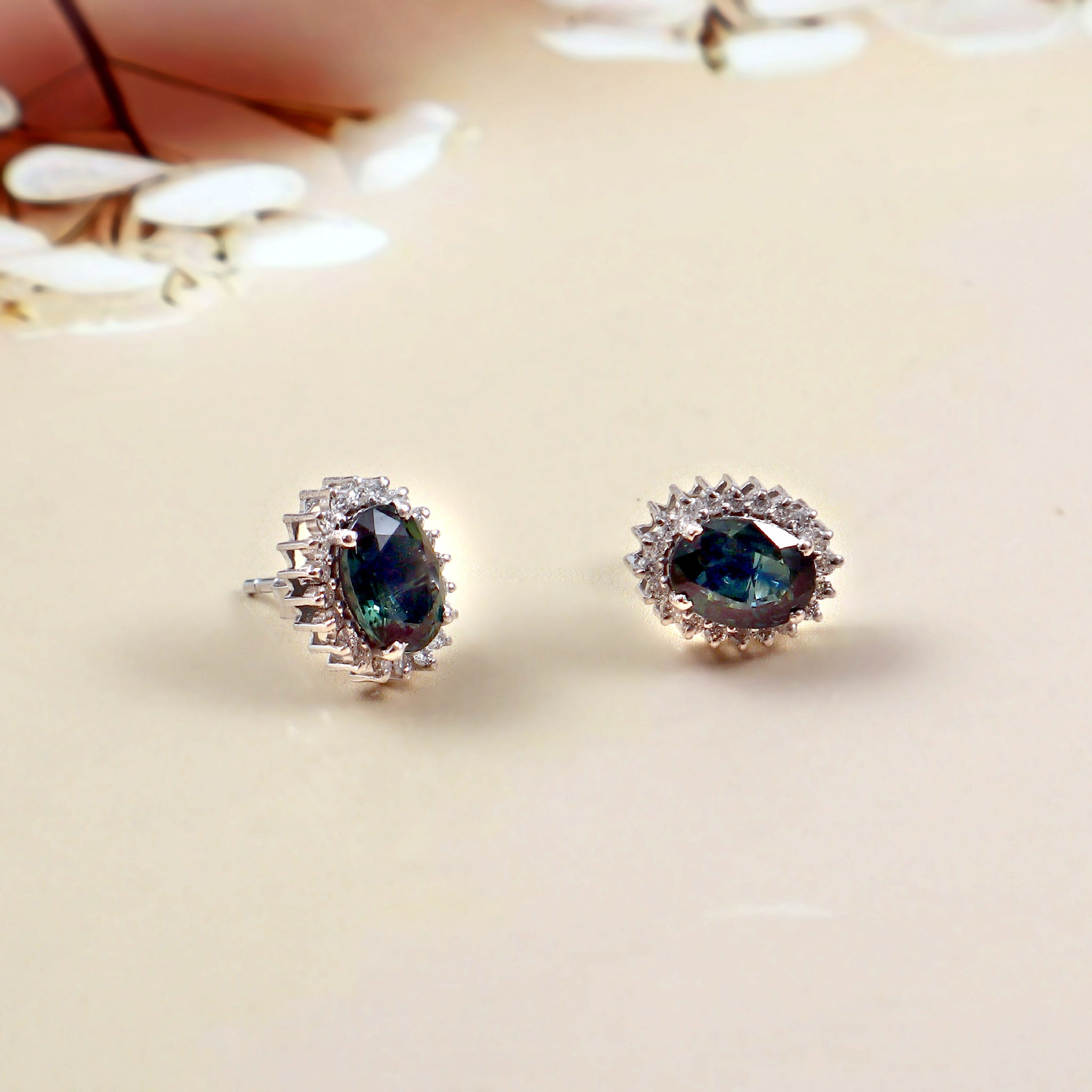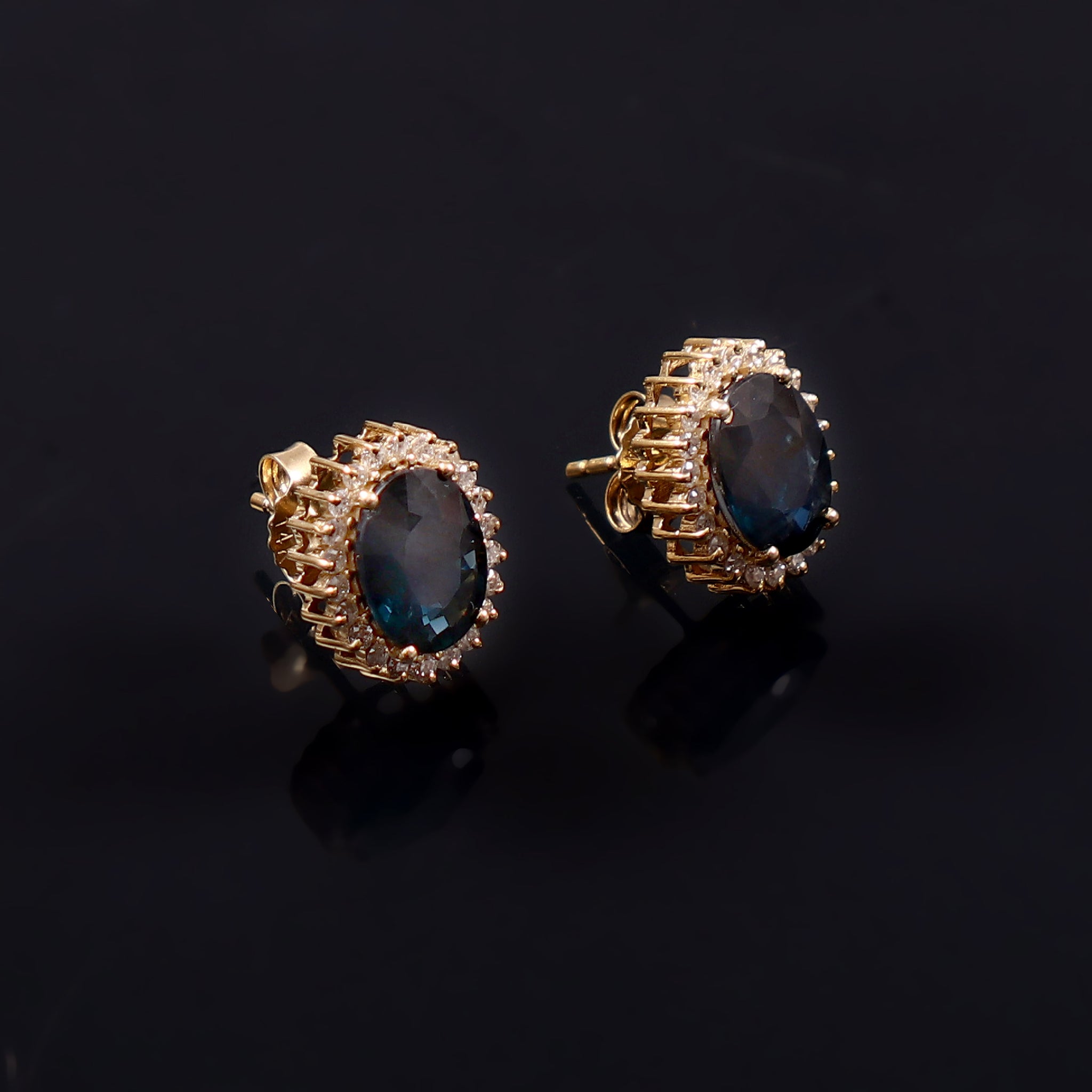 Handmade in 14k white yellow gold diamond with heated blue sapphire studs